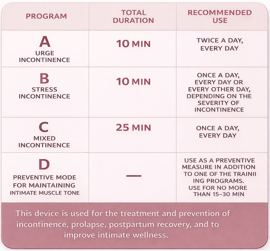 Think of it as a personal trainer for your pelvic floor. The device guides your muscles through a complete workout in just 10 minutes, with no technique to learn and no app required.